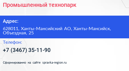 Промышленный технопарк по адресу 628011, Ханты-Мансийский АО, Ханты-Мансийск, Объездная, 25 в дальнейшем Организация, размещена в следующих категориях: