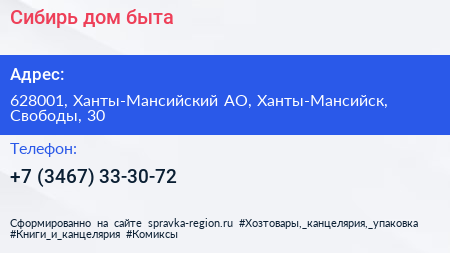 Сибирь, дом быта по адресу 628001, Ханты-Мансийский АО, Ханты-Мансийск, Свободы, 30 в дальнейшем Организация, размещена в следующих категориях: