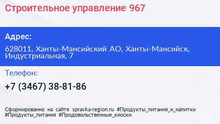 Строительное управление №967 по адресу 628011, Ханты-Мансийский АО, Ханты-Мансийск, Индустриальная, 7 в дальнейшем Организация, размещена в следующих категориях: