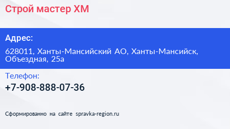 Строй-мастер ХМ по адресу 628011, Ханты-Мансийский АО, Ханты-Мансийск, Объездная, 25а в дальнейшем Организация, размещена в следующих категориях: