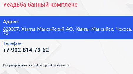 Усадьба, банный комплекс по адресу 628007, Ханты-Мансийский АО, Ханты-Мансийск, Чехова, 72 в дальнейшем Организация, размещена в следующих категориях: