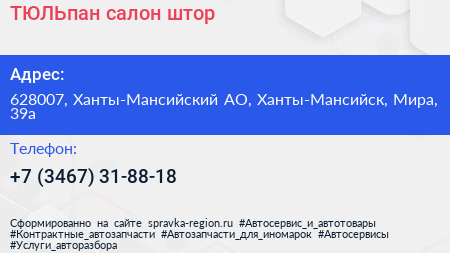 ТЮЛЬпан, салон штор по адресу 628007, Ханты-Мансийский АО, Ханты-Мансийск, Мира, 39а в дальнейшем Организация, размещена в следующих категориях: