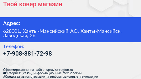 Твой ковер, магазин по адресу 628001, Ханты-Мансийский АО, Ханты-Мансийск, Заводская, 26 в дальнейшем Организация, размещена в следующих категориях: