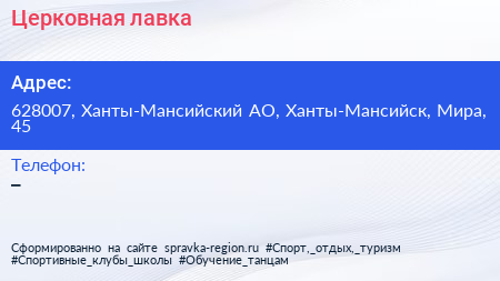 Церковная лавка по адресу 628007, Ханты-Мансийский АО, Ханты-Мансийск, Мира, 45 в дальнейшем Организация, размещена в следующих категориях: