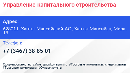 Управление капитального строительства по адресу 628011, Ханты-Мансийский АО, Ханты-Мансийск, Мира, 18 в дальнейшем Организация, размещена в следующих категориях: