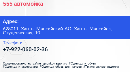 555, автомойка по адресу 628011, Ханты-Мансийский АО, Ханты-Мансийск, Студенческая, 10 в дальнейшем Организация, размещена в следующих категориях: