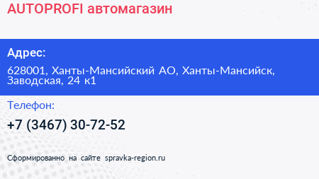 AUTOPROFI, автомагазин по адресу 628001, Ханты-Мансийский АО, Ханты-Мансийск, Заводская, 24 к1 в дальнейшем Организация, размещена в следующих категориях: