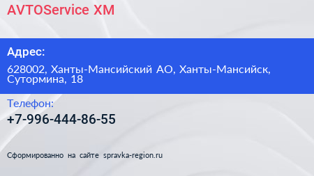 АVTOService`XM по адресу 628002, Ханты-Мансийский АО, Ханты-Мансийск, Сутормина, 18 в дальнейшем Организация, размещена в следующих категориях: