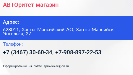 АВТОритет, магазин по адресу 628011, Ханты-Мансийский АО, Ханты-Мансийск, Энгельса, 27 в дальнейшем Организация, размещена в следующих категориях: