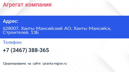 Для связи с организацией воспользуйтесь номером телефона: +7 (3467) 388-365. Ежедневно с 08:00 до 19:00, вы можете обратиться в эту организацию.