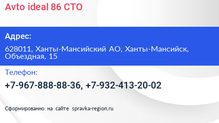 Avto-ideal 86, СТО по адресу 628011, Ханты-Мансийский АО, Ханты-Мансийск, Объездная, 15 в дальнейшем Организация, размещена в следующих категориях: