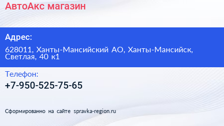 АвтоАкс, магазин по адресу 628011, Ханты-Мансийский АО, Ханты-Мансийск, Светлая, 40 к1 в дальнейшем Организация, размещена в следующих категориях: