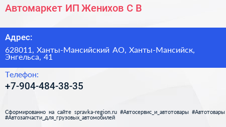 Автомаркет, ИП Женихов С.В. по адресу 628011, Ханты-Мансийский АО, Ханты-Мансийск, Энгельса, 41 в дальнейшем Организация, размещена в следующих категориях: