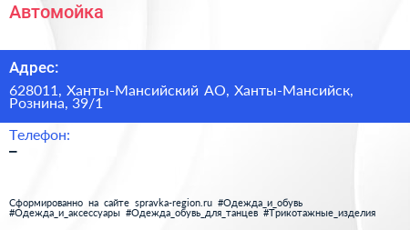 Автомойка по адресу 628011, Ханты-Мансийский АО, Ханты-Мансийск, Рознина, 39/1 в дальнейшем Организация, размещена в следующих категориях: