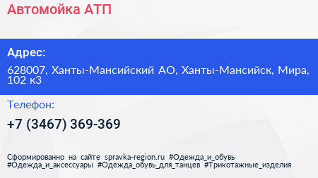 Автомойка АТП по адресу 628007, Ханты-Мансийский АО, Ханты-Мансийск, Мира, 102 к3 в дальнейшем Организация, размещена в следующих категориях:
