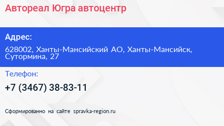 Автореал-Югра, автоцентр по адресу 628002, Ханты-Мансийский АО, Ханты-Мансийск, Сутормина, 27 в дальнейшем Организация, размещена в следующих категориях: