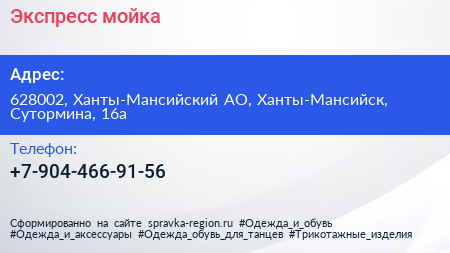 Экспресс-мойка по адресу 628002, Ханты-Мансийский АО, Ханты-Мансийск, Сутормина, 16а в дальнейшем Организация, размещена в следующих категориях: