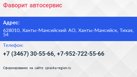 Фаворит, автосервис по адресу 628010, Ханты-Мансийский АО, Ханты-Мансийск, Тихая, 54 в дальнейшем Организация, размещена в следующих категориях: