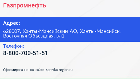 Газпромнефть по адресу 628007, Ханты-Мансийский АО, Ханты-Мансийск, Восточная Объездная, вл1 в дальнейшем Организация, размещена в следующих категориях: