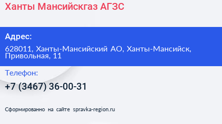 Ханты-Мансийскгаз, АГЗС по адресу 628011, Ханты-Мансийский АО, Ханты-Мансийск, Привольная, 11 в дальнейшем Организация, размещена в следующих категориях: