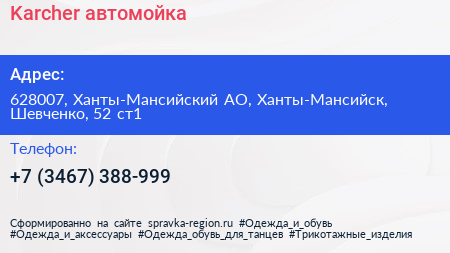 Karcher, автомойка по адресу 628007, Ханты-Мансийский АО, Ханты-Мансийск, Шевченко, 52 ст1 в дальнейшем Организация, размещена в следующих категориях: