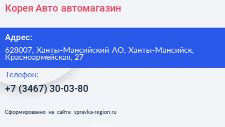 Корея Авто, автомагазин по адресу 628007, Ханты-Мансийский АО, Ханты-Мансийск, Красноармейская, 27 в дальнейшем Организация, размещена в следующих категориях:
