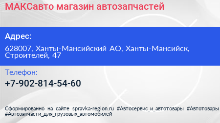МАКСавто, магазин автозапчастей по адресу 628007, Ханты-Мансийский АО, Ханты-Мансийск, Строителей, 47 в дальнейшем Организация, размещена в следующих категориях: