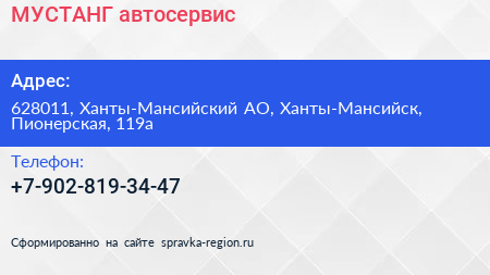 МУСТАНГ, автосервис по адресу 628011, Ханты-Мансийский АО, Ханты-Мансийск, Пионерская, 119а в дальнейшем Организация, размещена в следующих категориях: