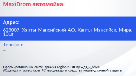 MaxiDrom, автомойка по адресу 628007, Ханты-Мансийский АО, Ханты-Мансийск, Мира, 101в в дальнейшем Организация, размещена в следующих категориях: