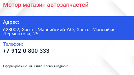 Мотор, магазин автозапчастей по адресу 628002, Ханты-Мансийский АО, Ханты-Мансийск, Лермонтова, 25 в дальнейшем Организация, размещена в следующих категориях: