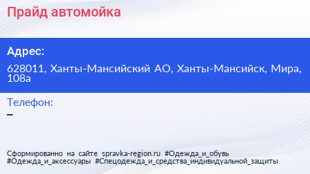 Прайд, автомойка по адресу 628011, Ханты-Мансийский АО, Ханты-Мансийск, Мира, 108а в дальнейшем Организация, размещена в следующих категориях: