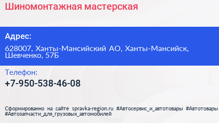 Шиномонтажная мастерская по адресу 628007, Ханты-Мансийский АО, Ханты-Мансийск, Шевченко, 57Б в дальнейшем Организация, размещена в следующих категориях: