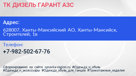 ТК ДИЗЕЛЬ-ГАРАНТ, АЗС по адресу 628007, Ханты-Мансийский АО, Ханты-Мансийск, Строителей, 1в в дальнейшем Организация, размещена в следующих категориях: