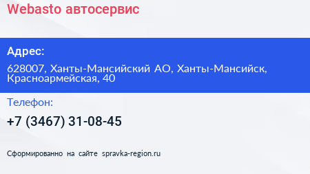 Webasto, автосервис по адресу 628007, Ханты-Мансийский АО, Ханты-Мансийск, Красноармейская, 40 в дальнейшем Организация, размещена в следующих категориях: