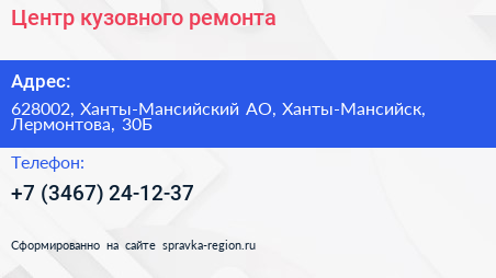 Центр кузовного ремонта по адресу 628002, Ханты-Мансийский АО, Ханты-Мансийск, Лермонтова, 30Б в дальнейшем Организация, размещена в следующих категориях: