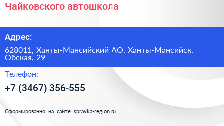 Чайковского, автошкола по адресу 628011, Ханты-Мансийский АО, Ханты-Мансийск, Обская, 29 в дальнейшем Организация, размещена в следующих категориях: