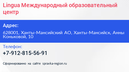 Lingua, Международный образовательный центр по адресу 628001, Ханты-Мансийский АО, Ханты-Мансийск, Анны Коньковой, 10 в дальнейшем Организация, размещена в следующих категориях: