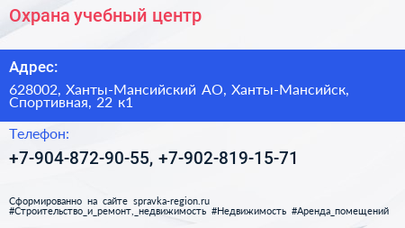 Охрана, учебный центр по адресу 628002, Ханты-Мансийский АО, Ханты-Мансийск, Спортивная, 22 к1 в дальнейшем Организация, размещена в следующих категориях: