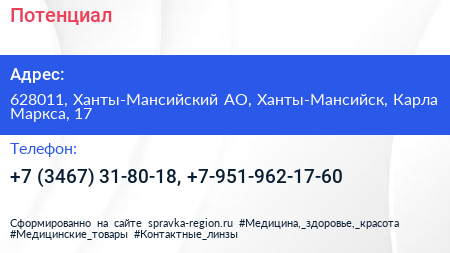 Потенциал по адресу 628011, Ханты-Мансийский АО, Ханты-Мансийск, Карла Маркса, 17 в дальнейшем Организация, размещена в следующих категориях: