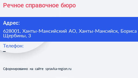 Речное справочное бюро по адресу 628001, Ханты-Мансийский АО, Ханты-Мансийск, Бориса Щербины, 3 в дальнейшем Организация, размещена в следующих категориях:
