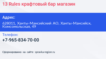 13 Rules, крафтовый бар-магазин по адресу 628011, Ханты-Мансийский АО, Ханты-Мансийск, Комсомольская, 49 в дальнейшем Организация, размещена в следующих категориях: