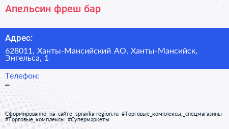 Апельсин, фреш-бар по адресу 628011, Ханты-Мансийский АО, Ханты-Мансийск, Энгельса, 1 в дальнейшем Организация, размещена в следующих категориях: