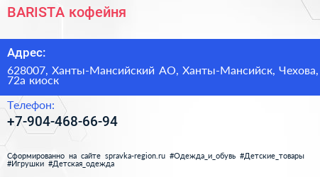 BARISTA, кофейня по адресу 628007, Ханты-Мансийский АО, Ханты-Мансийск, Чехова, 72а киоск в дальнейшем Организация, размещена в следующих категориях: