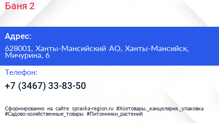 Баня №2 по адресу 628001, Ханты-Мансийский АО, Ханты-Мансийск, Мичурина, 6 в дальнейшем Организация, размещена в следующих категориях: