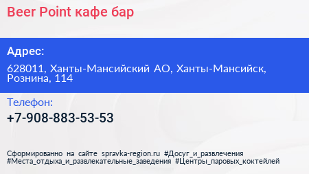 Beer Point, кафе-бар по адресу 628011, Ханты-Мансийский АО, Ханты-Мансийск, Рознина, 114 в дальнейшем Организация, размещена в следующих категориях: