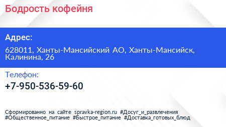 Бодрость, кофейня по адресу 628011, Ханты-Мансийский АО, Ханты-Мансийск, Калинина, 26 в дальнейшем Организация, размещена в следующих категориях: