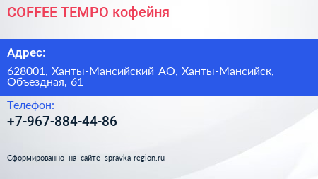COFFEE TEMPO, кофейня по адресу 628001, Ханты-Мансийский АО, Ханты-Мансийск, Объездная, 61 в дальнейшем Организация, размещена в следующих категориях:
