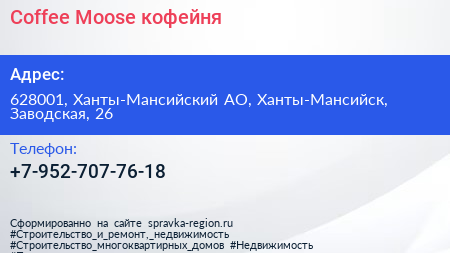 Coffee Moose, кофейня по адресу 628001, Ханты-Мансийский АО, Ханты-Мансийск, Заводская, 26 в дальнейшем Организация, размещена в следующих категориях: