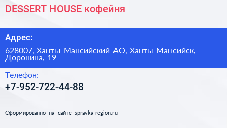 DESSERT HOUSE, кофейня по адресу 628007, Ханты-Мансийский АО, Ханты-Мансийск, Доронина, 19 в дальнейшем Организация, размещена в следующих категориях: