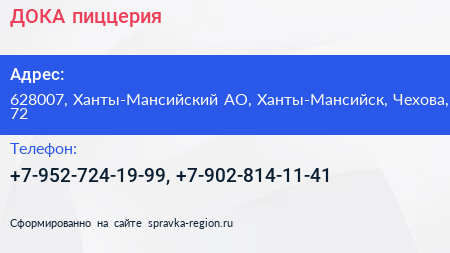 ДОКА, пиццерия по адресу 628007, Ханты-Мансийский АО, Ханты-Мансийск, Чехова, 72 в дальнейшем Организация, размещена в следующих категориях: